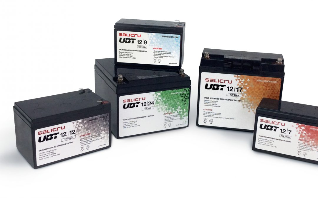 Esta nueva gama de baterías UBT de Salicru incluye modelos con capacidades de 7, 9, 12 ,17 y 24 Ah, todos a 12 V. Son especialmente óptimos para las aplicaciones de Sistemas de Alimentación Ininterrumpida SAI/UPS y otros sistemas de seguridad que requieran de un back-up de energía fiable y de calidad como sistemas de iluminación de emergencia, sistemas de señalización, comunicaciones y equipos eléctricos, sistemas de radiodifusión, cuadros de automatización para ascensores, cajas registradoras electrónicas,…